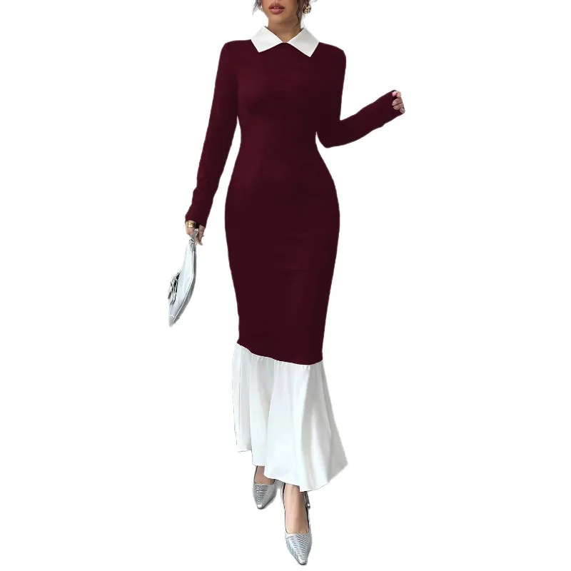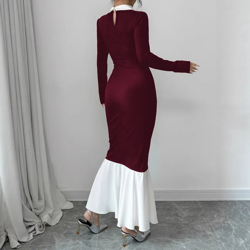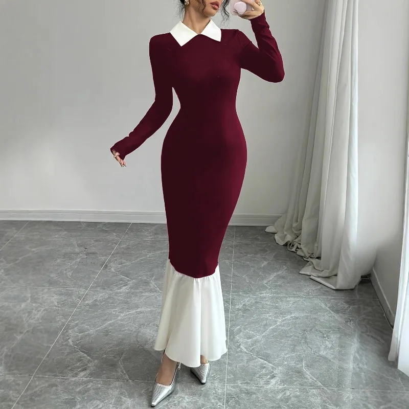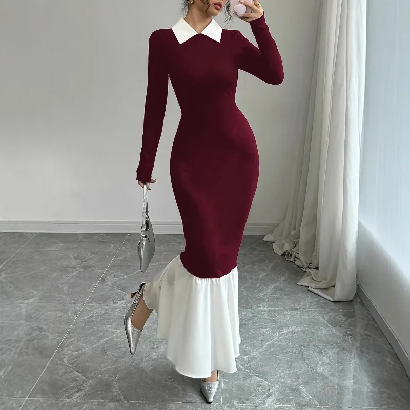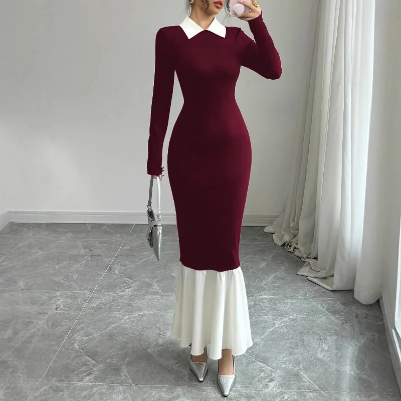 Red Bodycon Maxi Dress Slim Fit Patchwork Women's T-shirts Dress Long Full Sleeve Women Solid Sexy Tight Bodycon Dresses